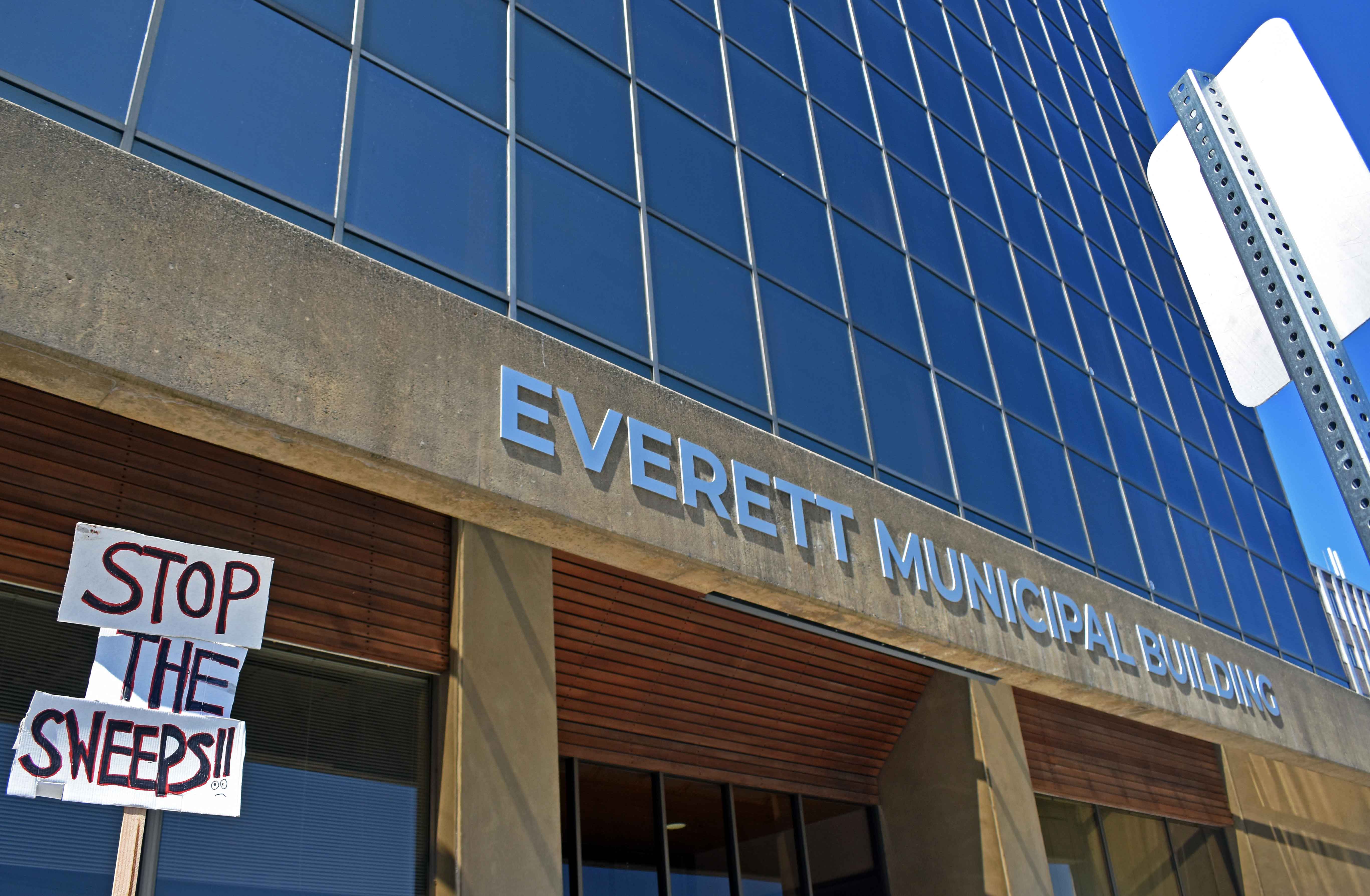 Protesting that people experiencing homelessness have access to a specific area to shelter in place during the coronavirus crisis, participants demanded that the City of Everett “stop the sweeps” and authorize the development of temporary emergency encampments.