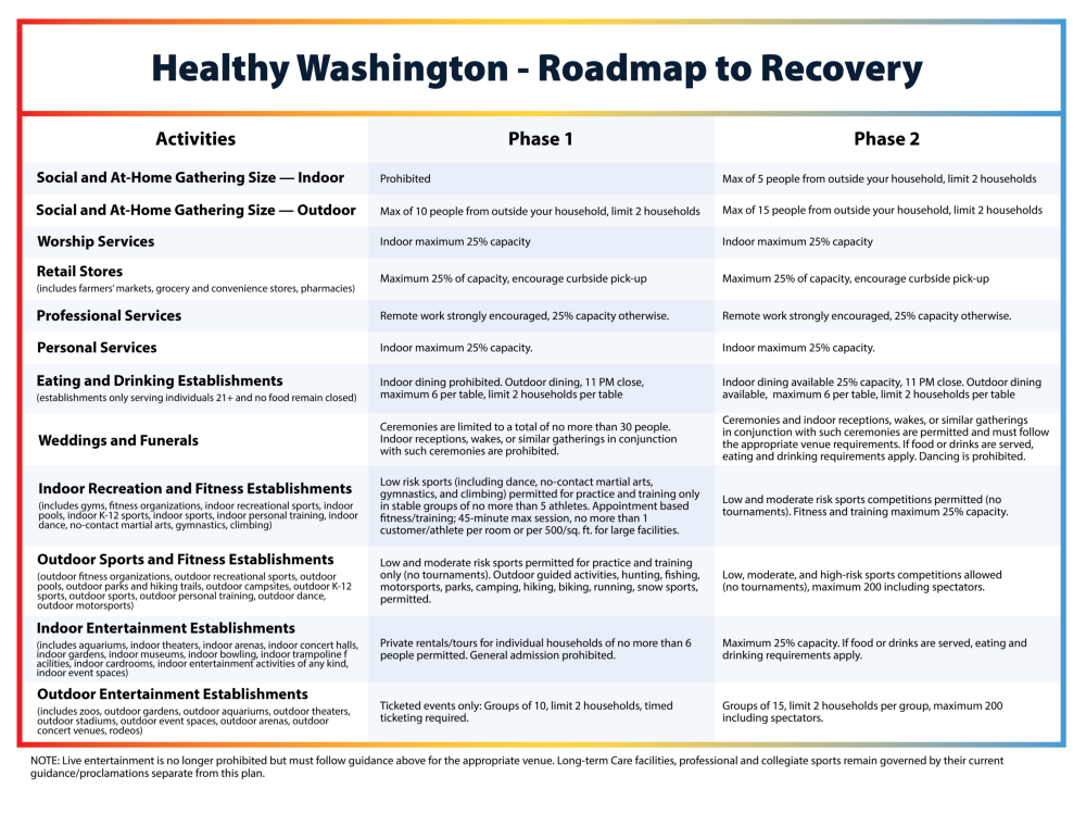 SNOHOMISH COUNTY, Wash., January 8, 2021 – The Healthy Washington: Roadmap to Recovery announced by Governor Jay Inslee provides a framework for regions to safely ease some restrictions while also maintaining crucial hospital capacity. For the week starting January 11, Snohomish County will fall under Phase 1 of the new roadmap. This allows for some modest expansion of economic activity.