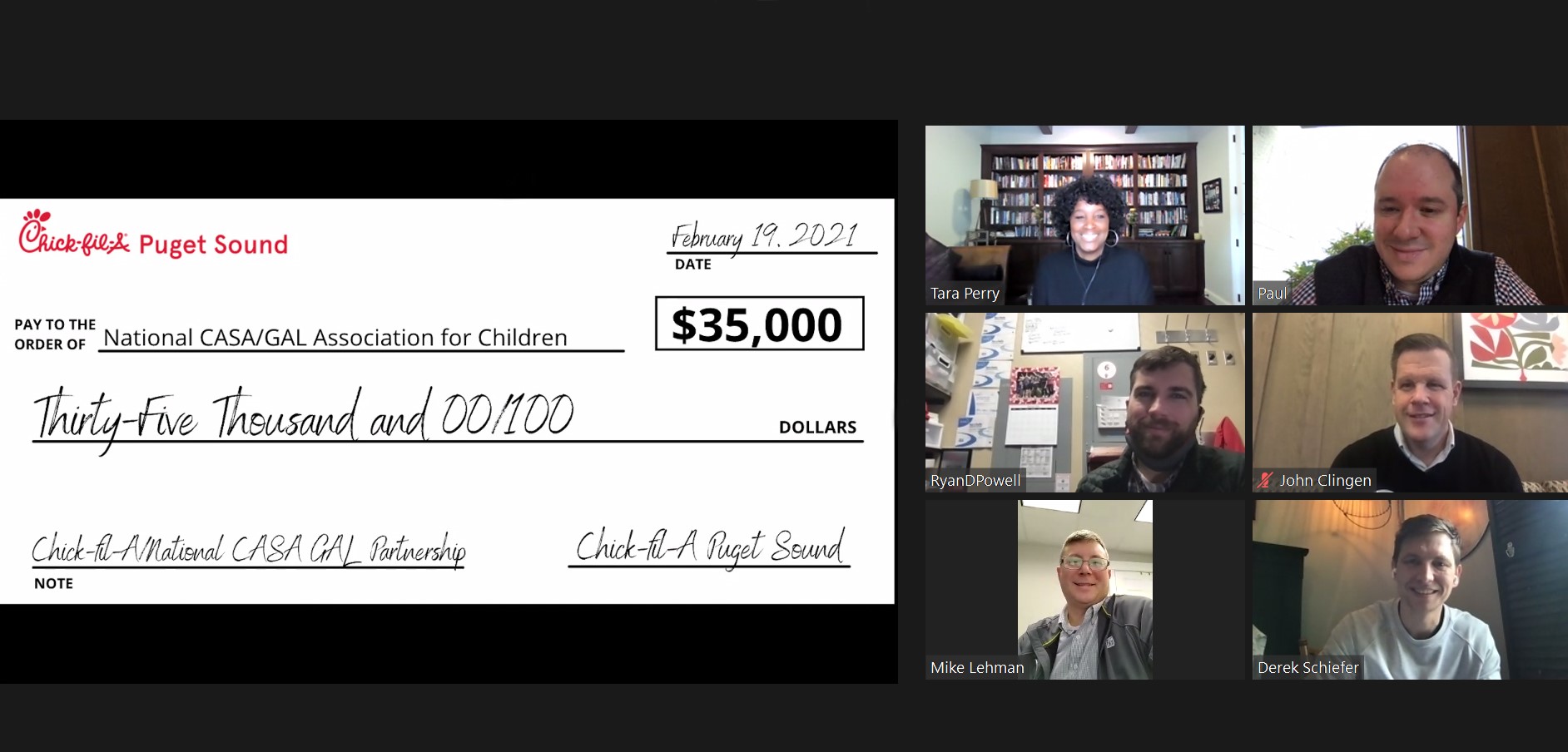 LYNNWOOD, WA – Puget Sound Chick-fil-A presented a virtual check to National CASA/GAL for $35,000 on February 19, in a recent partnership.