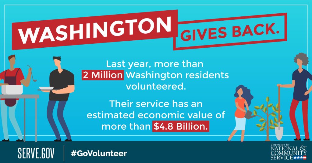 According to Nationalservice.gov, 35.7% of Washington state residents volunteer, ranking it 17th among states. Utah out ranks all 50 states at number 1 with 51.0% of it residents volunteering last year.