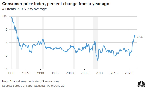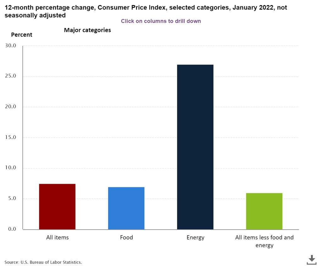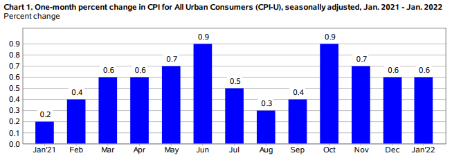 The Consumer Price Index for All Urban Consumers (CPI-U) increased 0.6 percent in January 2022 on a seasonally adjusted basis, the U.S. Bureau of Labor Statistics reported today. Over the last 12 months, the all items index (core inflation) increased 7.5 percent for January 2022 before seasonal adjustment, well above the 7.2 percent expected year-over-year inflation.