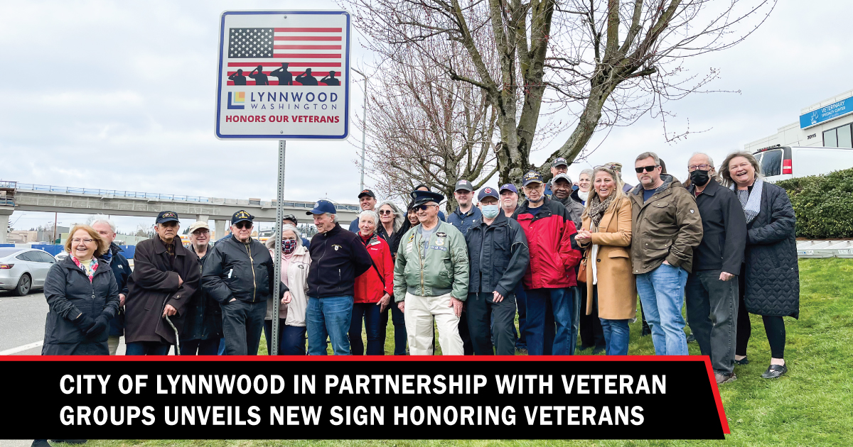 LYNNWOOD, Wash., March 8, 2022 – City officials and proud veterans gathered near the upcoming Lynnwood Transit Center, Monday, March 7, to witness the unveiling of Lynnwood’s newest sign honoring veterans.
