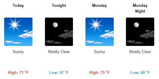 - Sunday (Aug 28):Â Sunny, with a high near 71. West wind around 6 mph.
