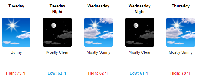 - Tuesday (Aug 30): Sunny, with a high near 79. Calm wind becoming west northwest 5 to 9 mph in the afternoon.