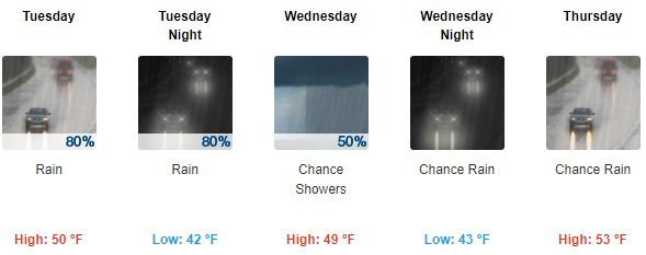 - Tuesday Night: Rain before 11pm, then showers likely after 11pm. Low around 42. Chance of precipitation is 80%. New precipitation amounts between a quarter and half of an inch possible.