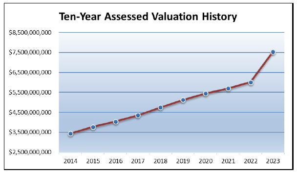 The Snohomish County Assessor’s office has estimated the assessed valuation of all taxable property within the City of Mukilteo to total $7,536,348,183 which includes $5,920,854 for new construction added during 2022. The proposed property tax levy rate per $1,000 of assessed value decreases from $.95903497 for 2022 to $0.77542143 for 2023.