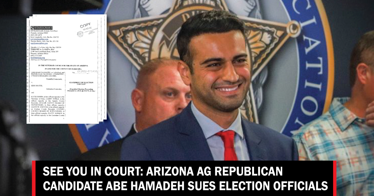 PHEONIX, AZ, November 23, 2022—Republican attorney general candidate Abraham “Abe” Hamadeh and the Republican National Committee (RNC) on Tuesday filed a lawsuit in Maricopa County Superior Court against his Democrat opponent Kris Mayes, Secretary of State Katie Hobbs and Recorders and Board of Supervisors in all 15 counties within Arizona, alleging “errors and inaccuracies in the management of some polling place operations, and in the processing and tabulation of some ballots” in the 2022 Midterm General Election.