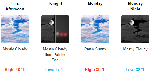 - Sunday Night: Patchy fog after 1am. Otherwise, mostly cloudy, with a low around 37. Calm wind.