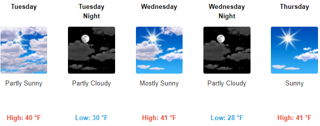 - Tuesday Night: Partly cloudy, with a low around 30.
