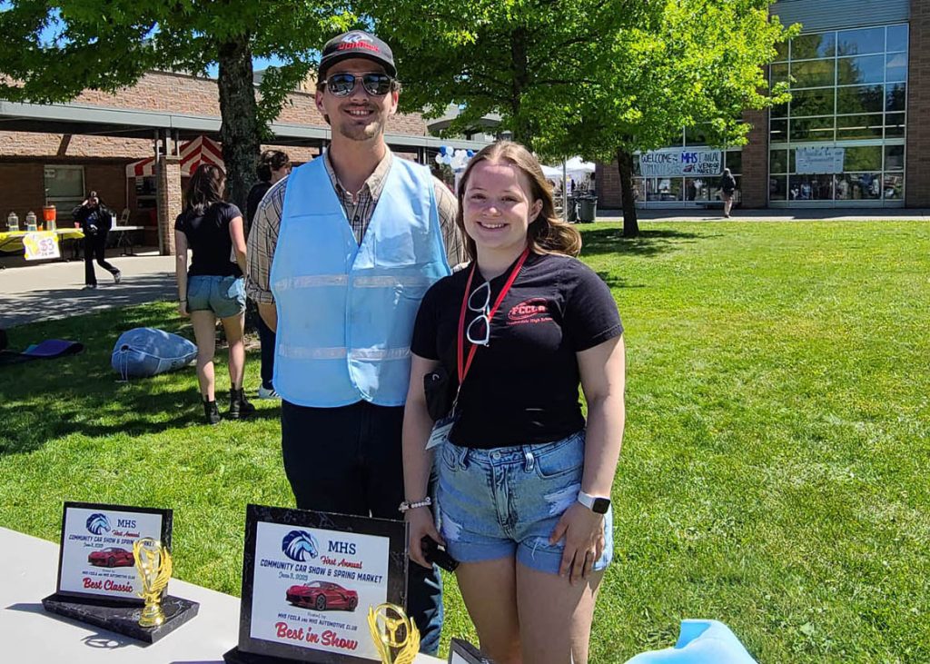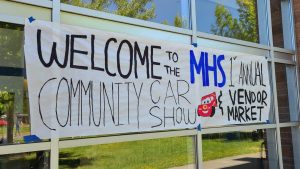 MHS Junior and automotive enthusiast, Aiden, got the idea for the auto show last winter as a fun way to raise money for the Automotive Program. He pitched the idea to his instructor, Bryan Robbins, who reached out to the FCCLA Club to make it happen. Five months of planning later that “small” car show, of about 30 cars, doubled to 60 cars last week, and last-minute entries capped the exhibit off at more than 80 vehicles ranging from classics, sports cars, imports, and old war relics.