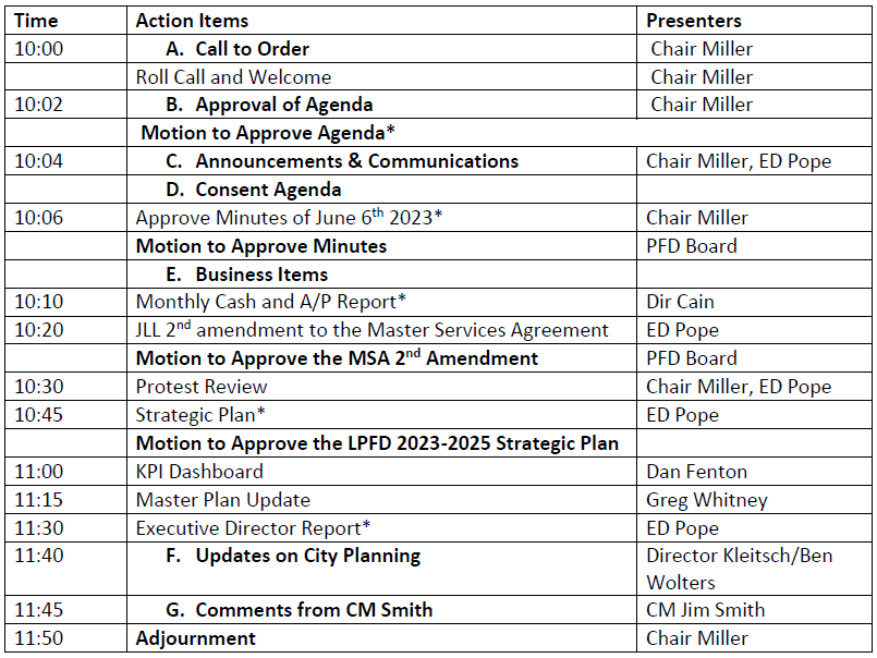 Meeting date and time: 10 a.m. – 12 p.m., Tuesday, July 11, 2023 LOCTATION: LPFD Conference Room