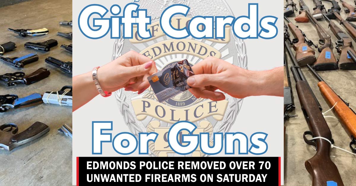 EDMONDS, Wash., July 23, 2023—Edmonds Police hosted their first Gift Cards for Guns event on Saturday, July 22. A total of forty-four rifles or shotguns and thirty-one handguns were collected. A handgun reported stolen in 1990 was also recovered. Participants could receive a maximum of $200 in Amazon.com gift cards but could turn in as many weapons as they wished.