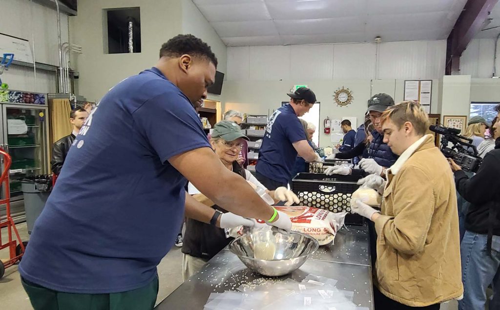 The athletes included Seattle Seahawks defensive tackle Red Bryant, long snapper Clint Gresham, guard Paul McQuistan, and defensive tackle Brandon Mebane who spent the day touring the site and learning the food bank’s critical need for both volunteers and resources before slapping on gloves and participating in a bulk food competition, scooping oats and rice into 3-4 cup bags for easy distribution to families.