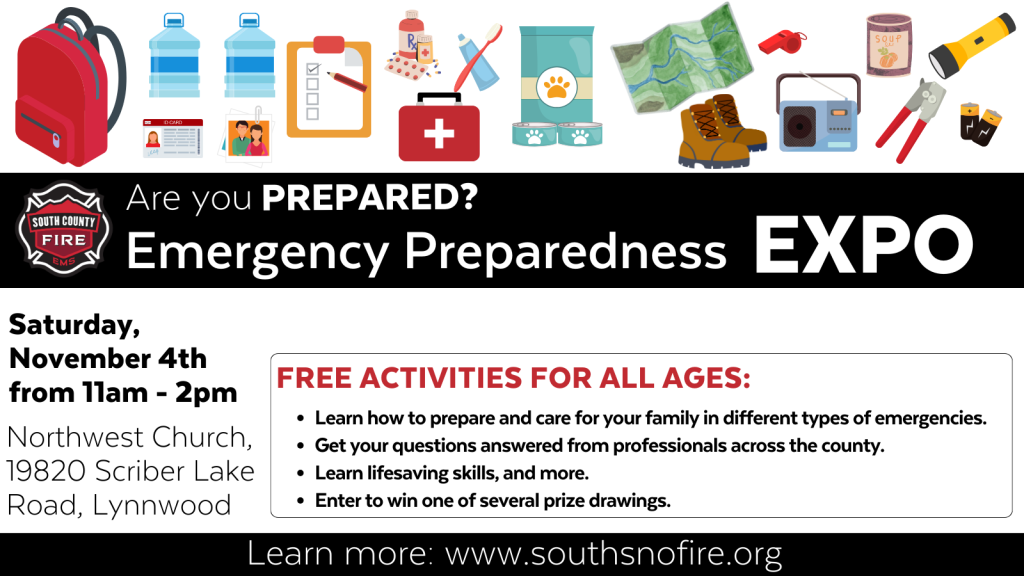 South County Fire invites you to learn how to prepare and care for your family in different types of emergencies at an Emergency Preparedness Expo on Saturday, November 4, 11 a.m. to 2 p.m. at Northwest Church, 19820 Scriber Lake Rd, Lynnwood.