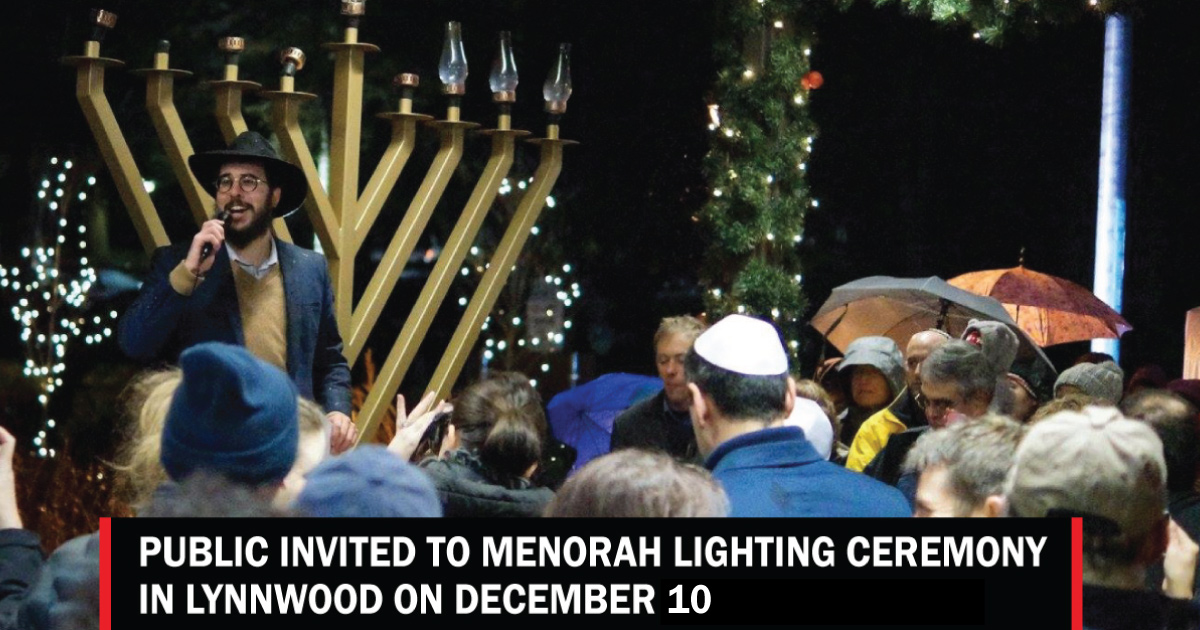 Lynnwood’s menorah is one of more than 15,000 large public menorahs sponsored by Chabad in more than 100 countries around the world, including in front of landmarks such as the White House and the Eiffel Tower, helping children and adults of all walks of life discover and enjoy the holiday message.