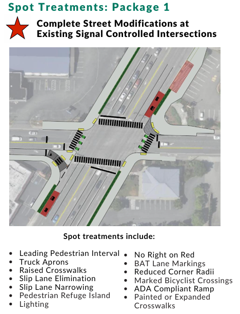 This project will include spot treatments, which are targeted improvements implemented at specific locations, such as intersections, road segments or transit stops to address identified issues such as safety or operational inefficiencies. This study corridor has been divided into five sections with four different packages for improvements.