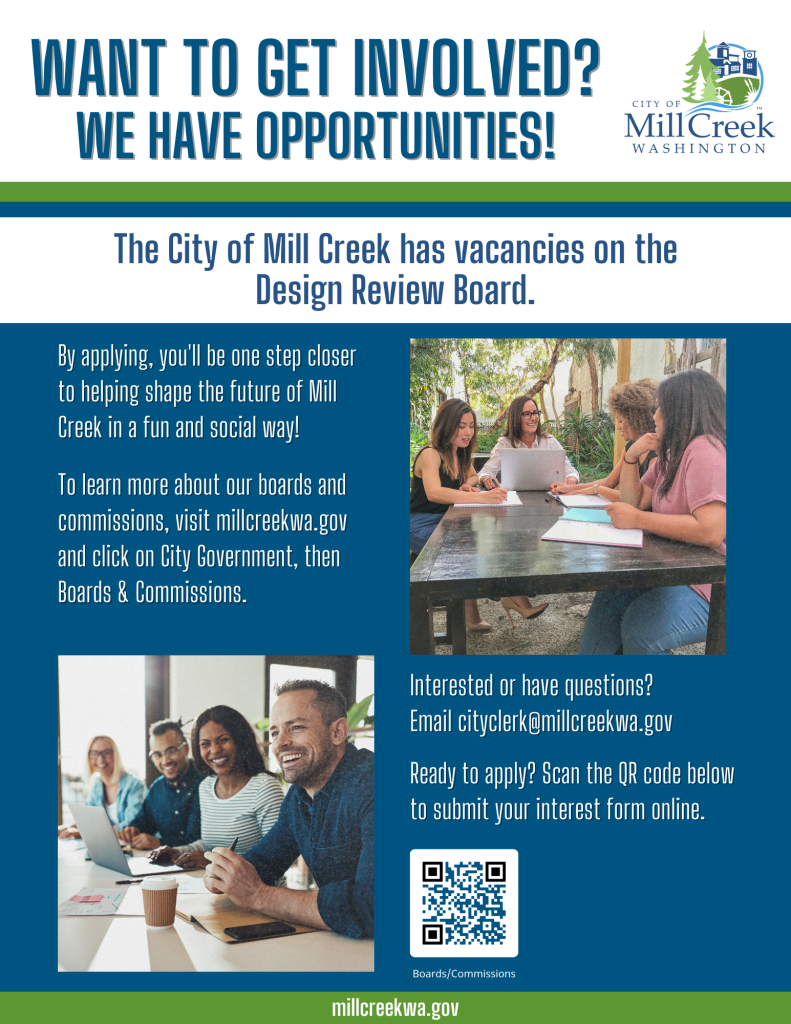 MILL CREEK, WA. – The City of Mill Creek is currently accepting applications for two vacancies with terms ending May 31, 2028, for its Design Review Board. Applications will be accepted beginning today through August 20, 2025, by close of business. Advisory boards and commissions are excellent options for anyone who has wanted to have a voice in important decisions that affect Mill Creek and to work with others to make a positive difference in the community. This is your opportunity to help direct the vision of how you want your community to look and feel.