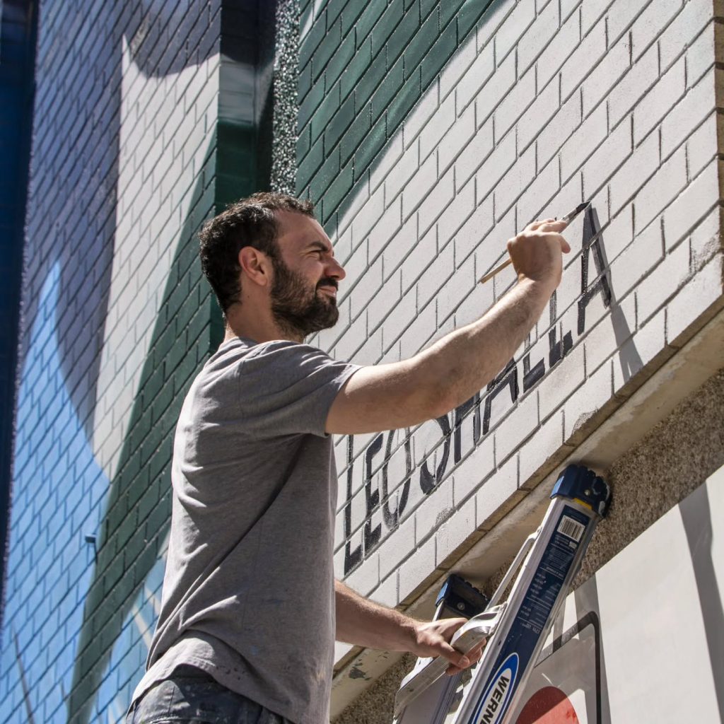 The murals were an opportunity for three assistants to engage in the creative process and grow through hands-on experience. Yoonmi Cho and Alexander Cervantes, both Seattle-based artists, assisted INO with operating the swing stage and had the opportunity to observe and learn directly from his technique. Bimbo Adenugba, an artist from Houston, assisted Leo Shallat with his piece.