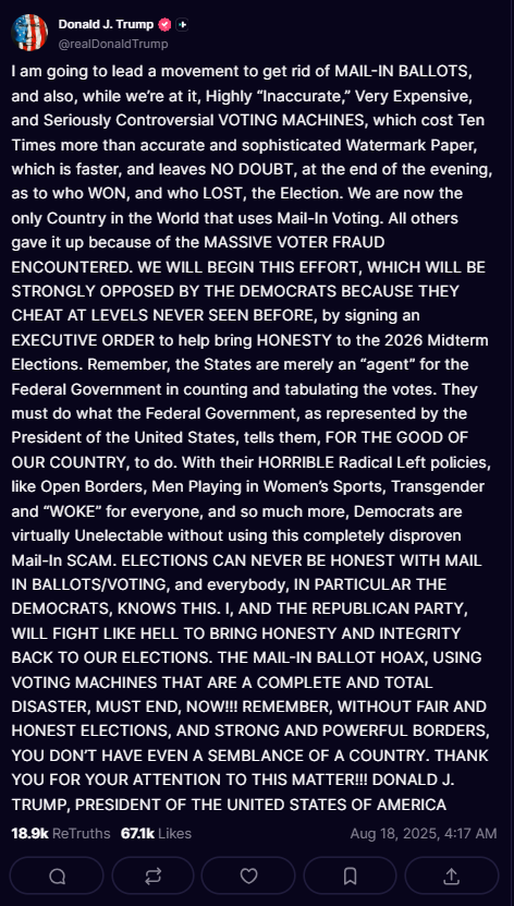 WASHINGTON, D.C.—In a bold move that will likely be met with fierce legal opposition, President Donald J Trump announced on Monday, August 18, on Truth Social that he will be signing an executive order to “get rid of MAIL-IN BALLOTS,” calling the mail-in voting system a “scam” that facilitates voter fraud.