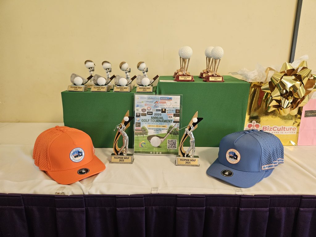 Hats and trophies for the FCCPNW annual golf tournament. Photo: George Fitkas Jr., Lynnwood Times