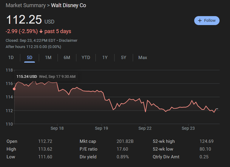 Disney stock from September 17 (day of Kimmel cancellation) through September 22, 2025, an estimated valuation drop of approximately $6.4 billion.