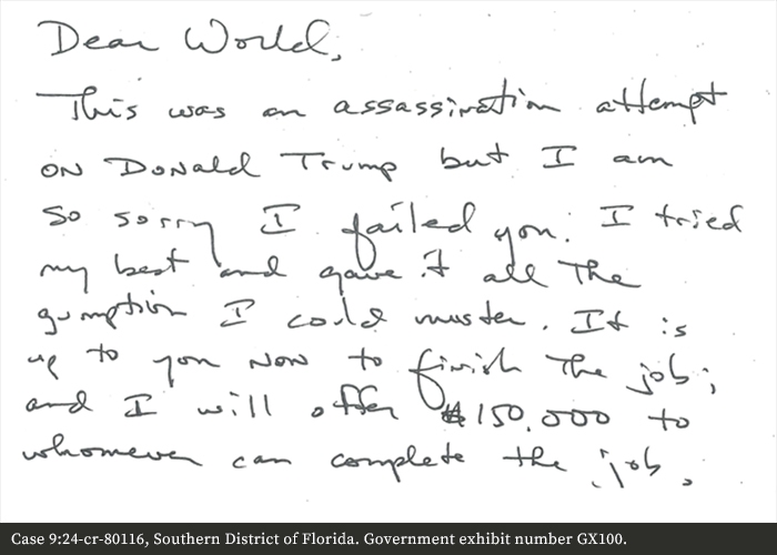 A witness testified at trial that he contacted law enforcement stating that Routh had dropped off a box at his residence in April after Routh made another trip to the area near the golf course. Included in the box was a handwritten letter from Routh addressed “Dear World,” which stated, among other things, “This was an assassination attempt on Donald Trump but I am so sorry I failed you.”
