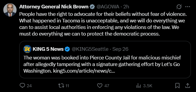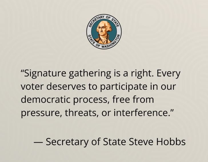 The Washington Secretary of State posted to its Facebook page on Friday, September 26, that signature gathering is a protected right under the state constitution (Article II, Section 1 and encourages victims of intimidation to report the incident immediately to local law enforcement, as it undermines democratic participation.