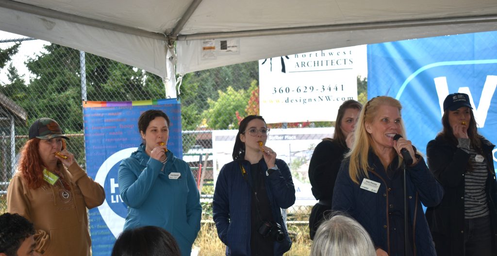 Dr. Greg Schwab read the land acknowledgement before introducing a unique (and hilarious) rendition of America the Beautiful sung by Housing Hope Sr. Director of Resource Development, Marketing, and Communications Joan Penney backed by an ensemble of kazoos.