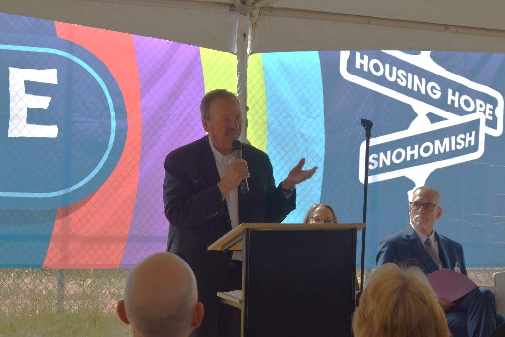At the groundbreaking ceremony held on Wednesday, October 1, the rain couldn’t dampen the spirits of the approximately 200 people eager to usher in a new affordable housing option for Lynnwood families, hearing remarks from Dr. Greg Schwab, Assistant Superintendent at Edmonds School District for K-12, Superintendent Dr. Rebecca Miner, Rachel Downes, Chief Strategic Officer for Housing Hope, Kathryn Opina, CEO of Housing Hope, and Lynnwood Mayor Christine Frizzell.