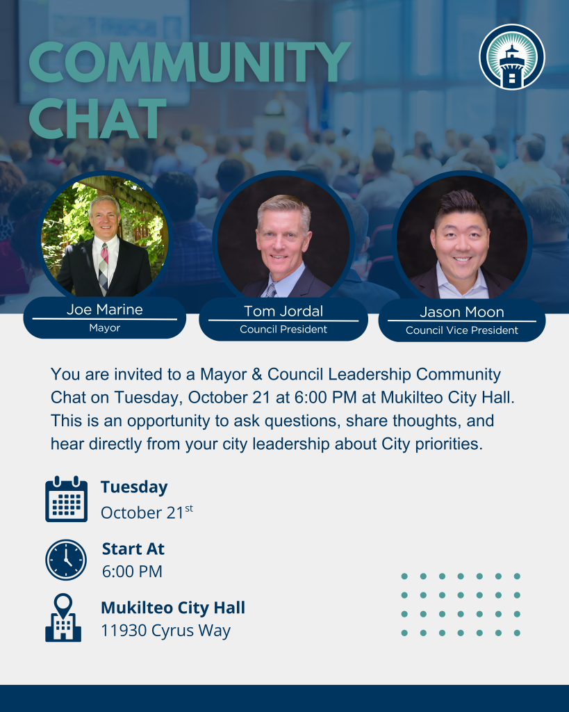 MUKILTEO– Mayor Joe Marine, Council President Tom Jordal, and Council Vice President Jason Moon invite Mukilteo residents to a Mayor and Council Leadership Community Chat on Tuesday, October 21 at 6:00 p.m. at Mukilteo City Hall, located at 11930 Cyrus Way.