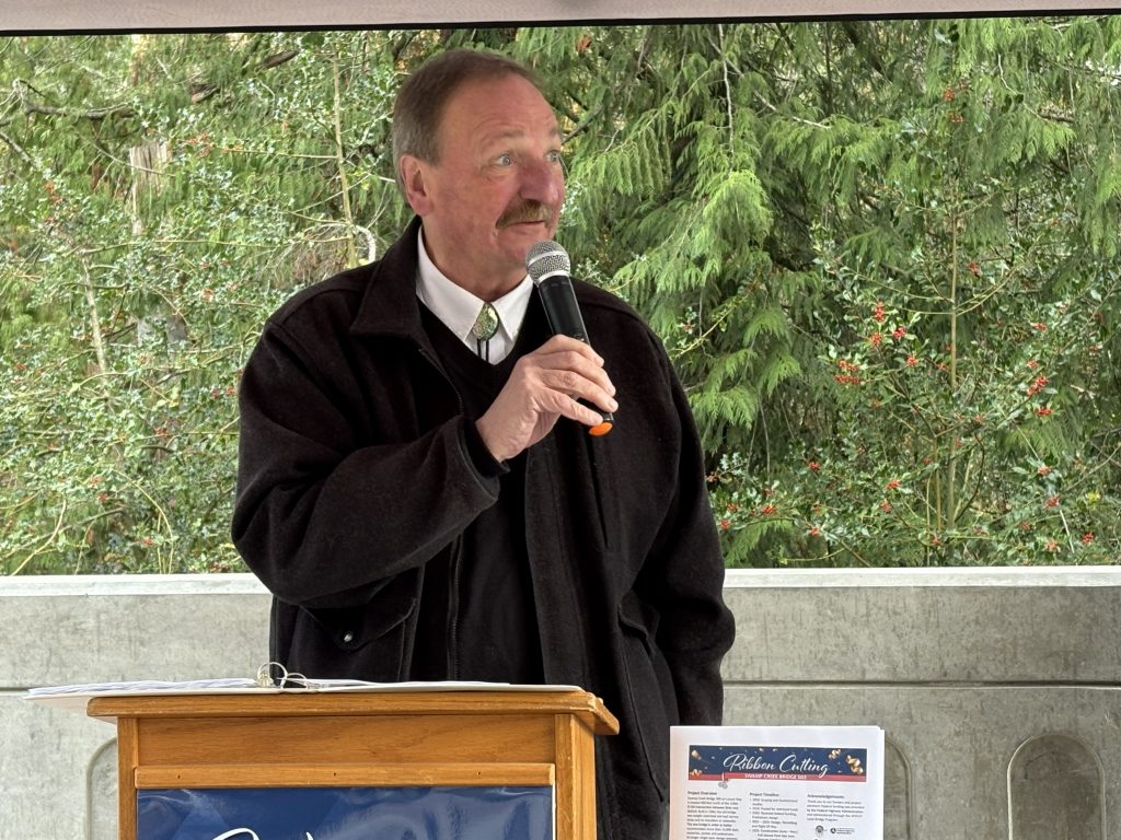 Snohomish County Public Works Deputy Director and County Engineer Doug McCormick followed Executive Somers with a “few fun facts” about Bridge 503 stating there is approximately 150,000 pounds of steel in the structure, the bridge sits on nearly 250 lineal feet of four-foot diameter shafts drilled into the ground, and over a million pounds of concrete that was placed in the substructure below.