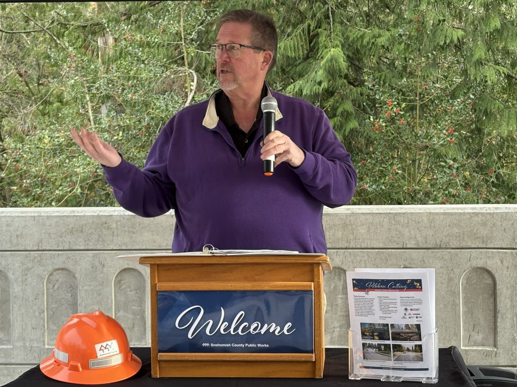 Snohomish County Public Works Director Kelly Snyder speaking at Wednesday’s ceremony. Photo: Kienan Briscoe, Lynnwood Times