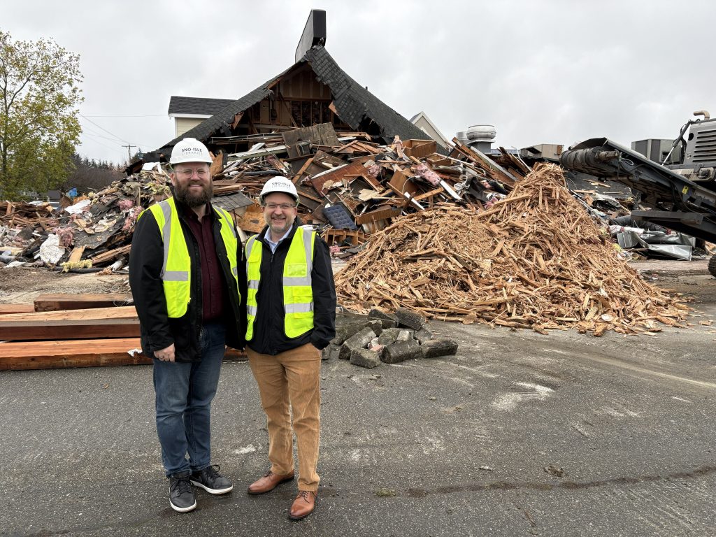 Senator Liias joined Sno-Isle Libraries Executive Director Eric Howard, and Sno-Isle staff, on Tuesday, November 25, to tour the future site, while Arlington-based general contractor Skycorp LTD were busy at work tearing down the old diner and carefully sorting through its materials for recycling. Skycrop estimates that by the end of the demolition process they’ll have recycled 90-95% of the materials with the wood being used for fuel, and metals being repurposed for other uses.