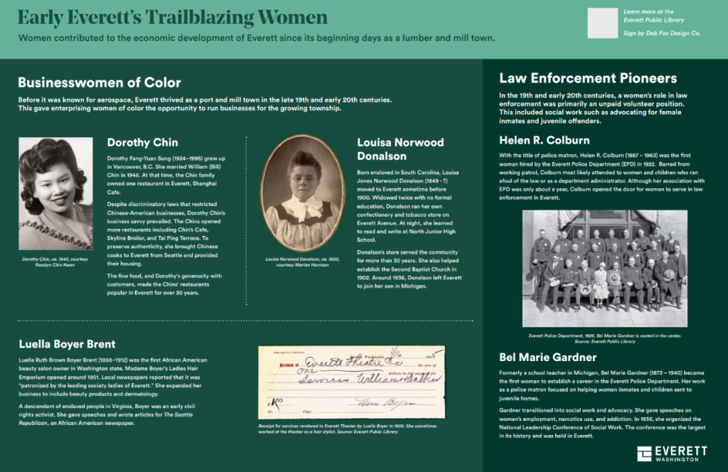 Fox created and provided the content for two new interpretive signs that highlight the stories of women who helped shape Everett’s future, including Dorothy Chin, who established and grew beloved restaurants such as Chin’s Café and Tai Ping Terrace. For more than 30 years, the restaurants owned by Dorothy and her family served Everett, breaking barriers and leaving a lasting impact on the city’s cultural and civic life.
