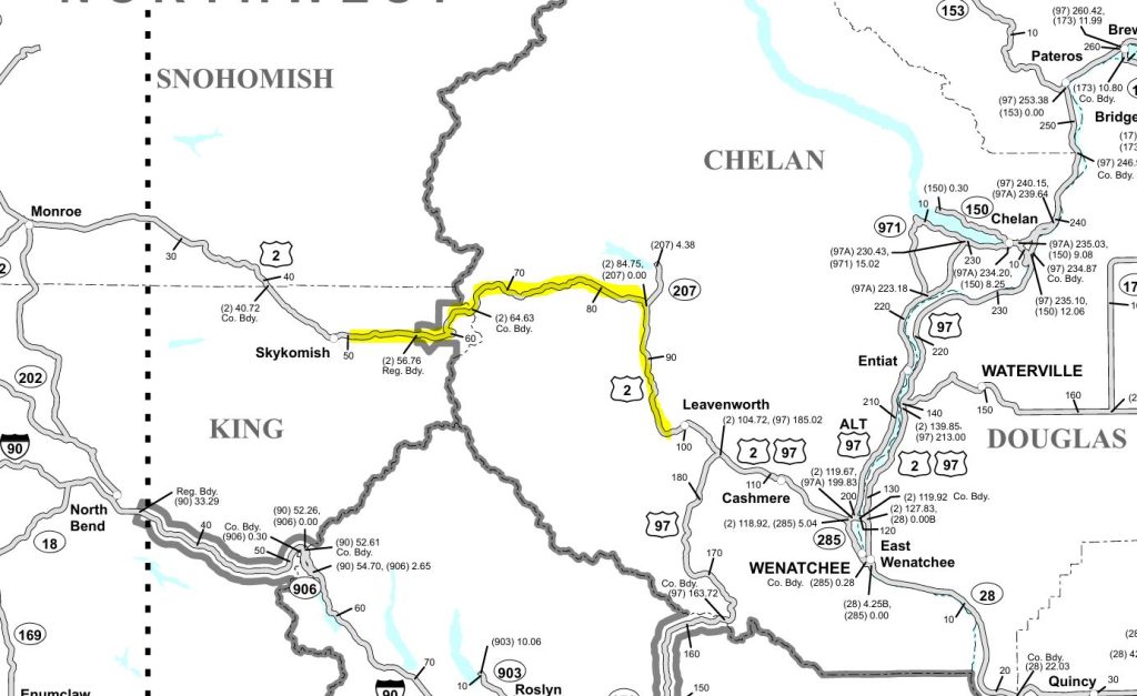 Map of impacted area of US-2 highlighted in yellow between Skykomish and Leavenworth. To get to Stevens Pass from Leavenworth, one would need to take Chumstick Highway to State Route 207 to Coles Corner then head west for 21 miles to Stevens Pass.
