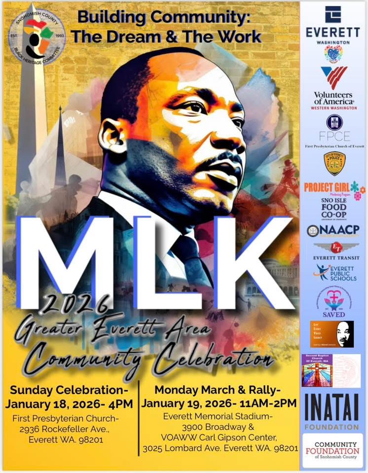On MLK Day proper, Monday, January 19, the celebration continues with a Community March and Rally beginning at the Everett Memorial Stadium (2900 Broadway in Everett) and marches to the Volunteers of America Carl Gibson Center (3025 Lombard Avenue), spanning from 11 a.m. to 2 p.m.
