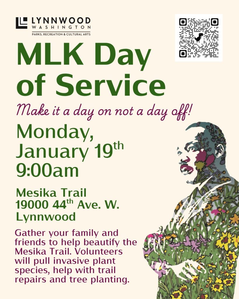 The City of Lynnwood will hold its annual MLK Day of Service on January 19, including a project at the Lynnwood Senior Center. Similar to last year, this will involve cleaning the Mesika Trail of invasive species, planting trees, and picking up litter.