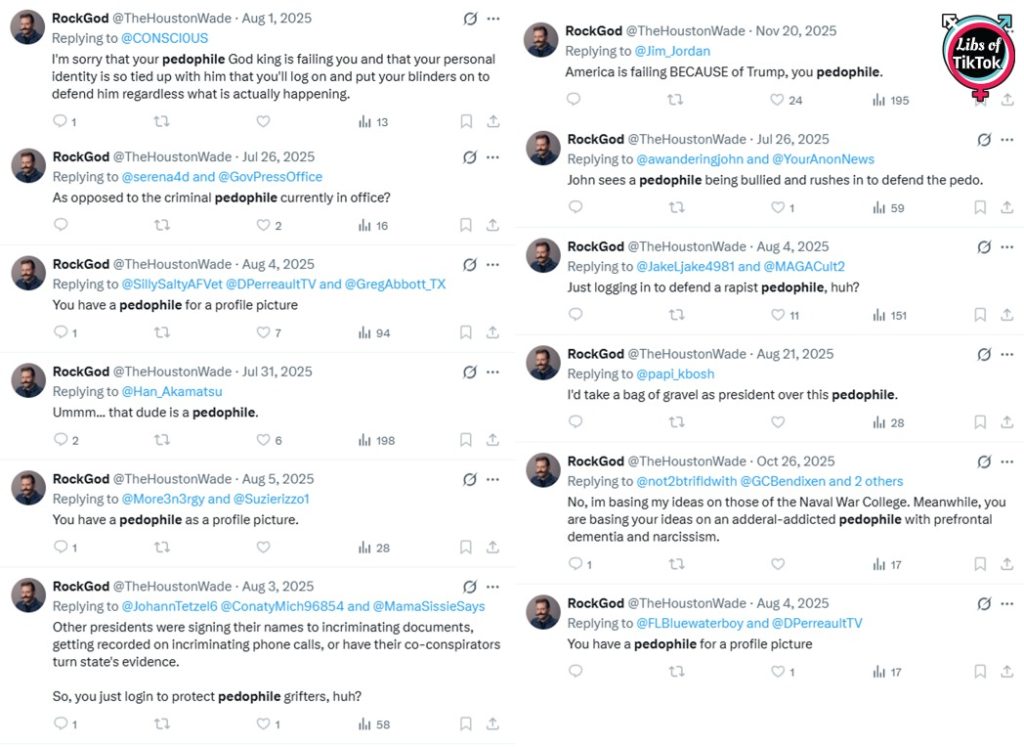 Wade, a known leftist activist with a long history online under the handle โRockGodโ for calling Republicans and Trump supporters “Pedophiles.โ