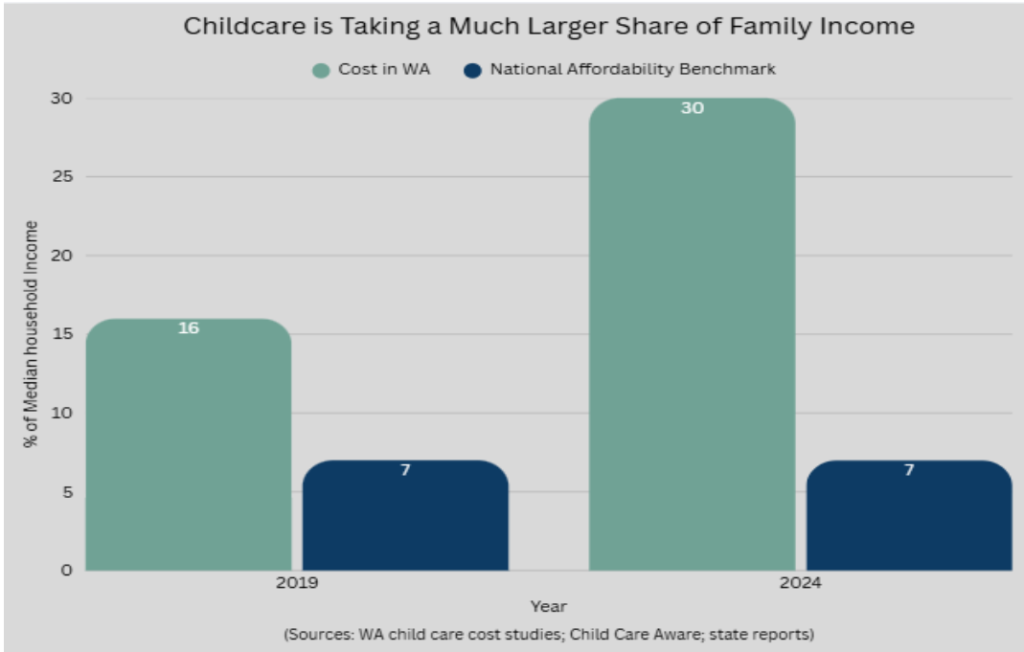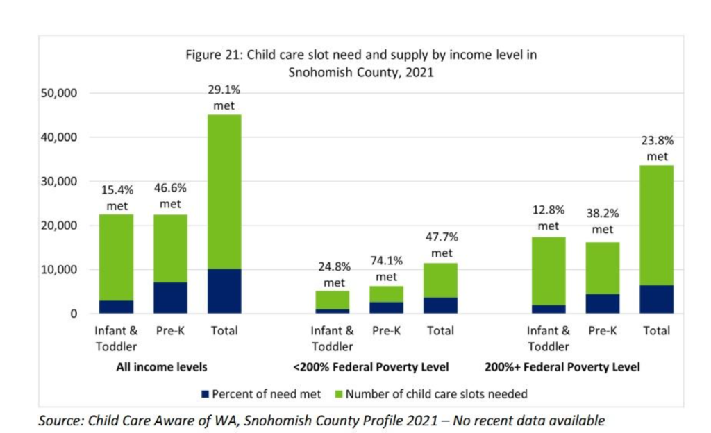 Even families who can afford childcare often can’t find a slot. Snohomish County is officially considered a childcare desert: only 62 licensed childcare openings per every 100 children of working parents. Licensed care for infants, toddlers, and pre-K meets just roughly 29% of total need. Parents report waitlists stretching six to twelve months, and many families sign up before their child is even born.