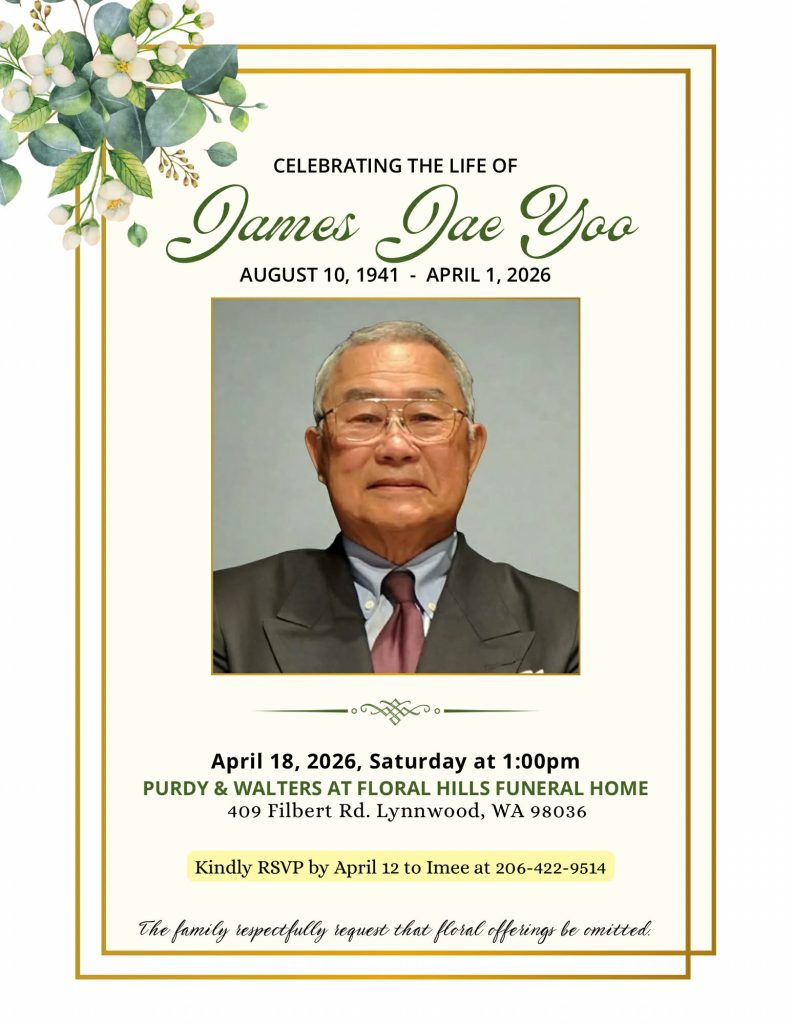 MUKILTEO — James Jae Yoo, a Korean American businessman, former educator and pillar of Mukilteo’s Korean community who spent decades fostering cultural understanding and environmental stewardship through his recycling business, passed away on April 1, 2026. He was 84.