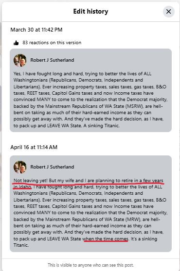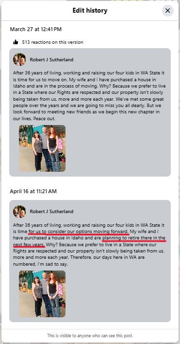 Mounting evidence shows that Sutherland—or someone with access to his Facebook account—was re-writing “history” on April 16, 2026, with a narrative to conceal from the public his move to Idaho from Washington state to presumably run for the Washington State Legislature. Facebook captures all edit history for each and every post.