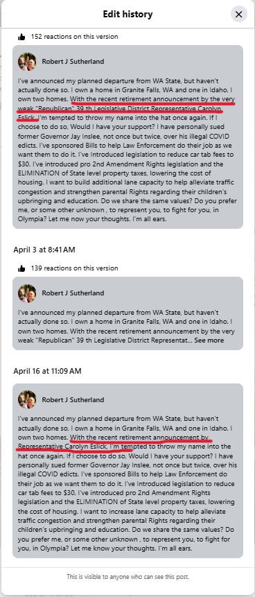 Also, a post by Sutherland criticizing outgoing Rep. Carolyn Eslick, whose seat he will be vying for, was altered 11:09 a.m., April 16, 2026, from its original posting on April 3. In that post, Sutherland referred to Eslick, the only female Republican representing Snohomish County as “very weak” and implied she was not a Republican by following that statement with Republican in quotes. In this post, it is the first time Sutherland began he narrative of a “planned departure” stating that he has two homes—one in Idaho and one in Washington state.