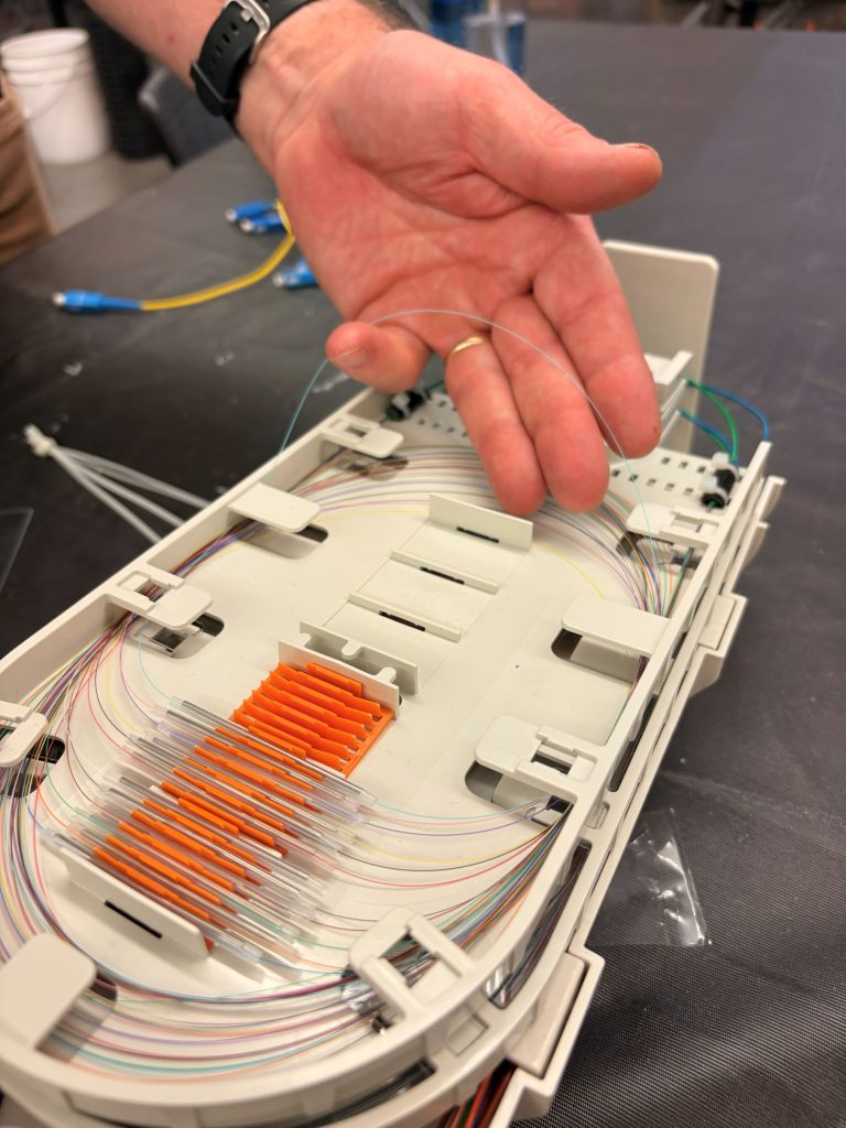 In several weeks students learn all the little steps that go into building a fiber optics closure, from bringing the cable in, breaking the cable out, cutting things to length, routing them to splice trays, and so on. By the end of the course, they’ll have dedicated 144 hours to learning fiber optics and should be interview-ready for a job right out of high school.